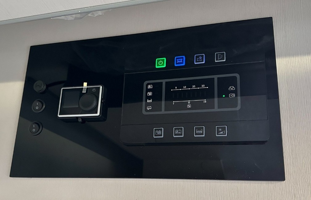 - Mains 230V supply, via easy-access consumer unit, to sockets, fridge, heater, water heater and battery charger/transformer