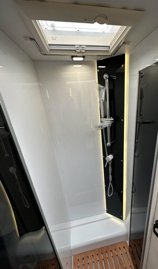 - Thetford cassette toilet with electric flush and 18 litre wheeled tank
